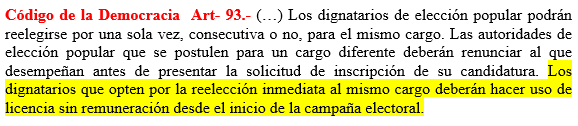 Como quien diría, la toman o la dejan a esta oportunidad de participar como candidatas y candidatos de elección popular, para ello solo tienen que utilizar la licencia sin sueldo, indicando que están siendo reelectos, de lo contrario estarían fuera de las elecciones por incumplimiento de los artículos 113, y 93 de la Constitución u Código de la democracia respectivamente.