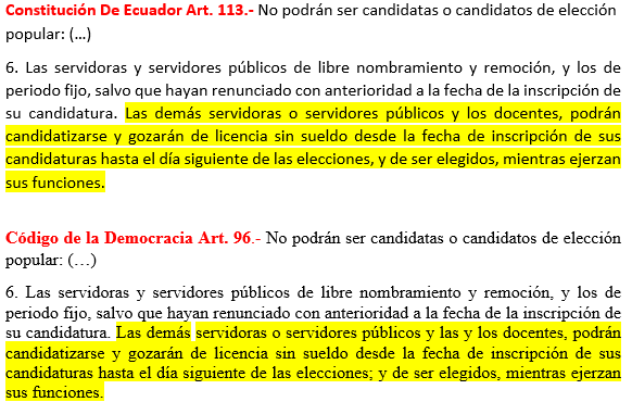 Siendo así, acudimos a la CRE en el Artículo 113.- que indica: “No podrán ser candidatas o candidatos de elección popular: (…) numeral 6. Las servidoras y servidores públicos de libre nombramiento y remoción, y los de periodo fijo, salvo que hayan renunciado con anterioridad a la fecha de la inscripción de su candidatura. Las demás servidoras o servidores públicos y los docentes, podrán candidatizarse y gozarán de licencia sin sueldo desde la fecha de inscripción de sus candidaturas hasta el día siguiente de las elecciones, y de ser elegidos, mientras ejerzan sus funciones.” Y, si acudimos al Código de la Democracia al Artículo 96.— dice textualmente lo mismo que el artículo anterior citado. Es decir, tiene la misma figura y peso mandatorio de cumplimiento, en relación de prelación constitucional.