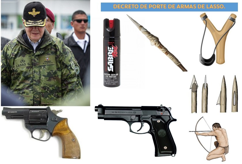 Siendo una Ley de armas, municiones, explosivos y accesorios, el artículo 1.- aclara que se refiere a Armas de Fuego. De ahí que resulta de más ilógico que, mediante un decreto de 6to orden jerárquico, se invente, y meta en el cesto de sus absurdos, al uso del gas pimienta, cuando este no es un arma de fuego, y que siempre ha sido de libre comercio, al contrario, con ello empieza a poner restricciones a la defensa personal. Siguiendo la misma línea disparatada, establece en el reglamento de Armas de fuego, legislación sobre arcos, flechas, lanzas, tirachinas, cerbatanas, machetes, etc; que no pueden estar ahí, porque estas no son armas de fuego. Pero el decreto ejecutivo trasgrede la ley y manda a crear un reglamento en donde habla de la Autorización del porte y tenencia de armas ancestrales para actividades de caza y/o supervivencia de pueblos y nacionalidades ancestrales del Ecuador. Tal parece, otro sería el fondo obscuro de esta norma lela y sin fundamento, como podría ser la de prohibir a los Pueblos y Nacionalidades, que empleen sus armas rudimentarias y autóctonas, en defensa de las agresiones de las concesionarias madereras y mineras, que destruyen las áreas protegidas y fuentes de agua.
